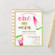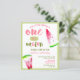 Budget One in a melon première invitation de fête d'anniversaire pour votre petite fille, avec des tranches de pastèque aquarelle. Les couleurs sont principalement roses et vertes.