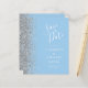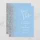 Le bord gauche de cet élégant mariage moderne, à l'exception de la carte de date, comporte une bordure en faux parties scintillant argent. Le texte personnalisable combine écriture blanche et polices de caractères sur cuivre sur un arrière - plan pastel bleu bébé. L'envers est assorti d'un design bleu et argent.