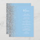 Le bord gauche de cet élégant menu mariage moderne présente une bordure de parties scintillant en faux argent. Le texte personnalisable combine écriture manuscrite blanche et polices de cuivre sur un arrière - plan bleu bébé pastel. L'envers est assorti d'un design bleu et argent.