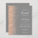 Le bord gauche de cette élégante faire-part de mariage moderne est orné d'une bordure en faux parties scintillant pêche. Le texte personnalisable associe écriture manuscrite blanche, copperplate et polices italiques sur un arrière - plan gris. L'envers offre de l'espace pour les détails mariages sur un arrière - plan gris solide, ainsi qu'un code QR que les clients peuvent scanner pour visiter votre site Web et RSVP, ce qui permet d'économiser le coût d'impression et d'envoi de cartes RSVP séparées.