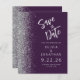 Le bord gauche de cet élégant mariage moderne, à l'exception de la carte de date, comporte une bordure en faux parties scintillant argent. Le texte personnalisable combine écriture manuscrite gris argent et police sans serif sur un arrière - plan violet foncé. L'envers est assorti d'un design violet et argenté.