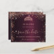 Une petite fille et tendance Enregistrer la carte Date pour une Quinceañera, 15e anniversaire fête. Une couleur arrière - plan à l'aspect faux métallique bordeaux. Décoré avec de la poussière de parties scintillant en faux or rose et une tiare, couronne. Le texte : Save the Date est écrit avec un grand script de style à la main tendance.