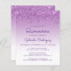 Cette invitation branchée de quinceañera présente une frise brillante violette faux parties scintillant et un arrière - plan sombre. Le mot "Quinceañera" et le nom de l'invité d'honneur apparaissent dans un script décontracté d'écriture violet. La même conception de goutte de parties scintillant violette apparaît à l'envers.