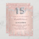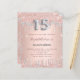 Une invitation moderne, élégante et glamour pour une Quinceañera fille, 15e anniversaire fête. Un arrière - plan métallique à l'apparence rose à l'or faux rose et parties scintillant en argent. Le nom est écrit avec un rose moderne de couleur or foncé à la main écriture style. Personnalisez et ajoutez les détails de votre fête. Le numéro 15 est écrit avec une police de style ballon argenté, script.