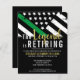 Cette conception de retraite comprend un drapeau militaire avec des rayures noires et blanches, ainsi qu'une mince bande verte. Le texte "La légende prend sa retraite" est au-dessus du nom du sergent, du capitaine, du soldat, du lieutenant ou du général qui prend sa retraite.