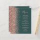 Le bord gauche de cet élégant menu mariage moderne présente une bordure rose en faux parties scintillant or. Le texte personnalisable combine un script d'écriture manuscrite grise de fusain et des polices de caractères sur un arrière - plan vert émeraude foncé. L'envers présente une parties scintillant en or vert et rose assortie.