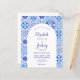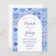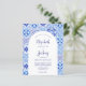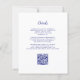 Ce design rustique est orné d'un motif arrière - plan de carreaux portugais bleu et blanc d'aquarelle, ou azulejos. Personnalisez-le avec les noms de la mariée et du marié dans le script de calligraphie bleu et le texte restant dans une combinaison de sans serif, cuivre et italique sur une forme d'arc blanc. L'envers offre de l'espace pour les détails mariages sur un arrière - plan blanc solide, ainsi qu'un code QR que les clients peuvent scanner pour visiter votre site Web et RSVP, ce qui permet d'économiser le coût d'impression et d'envoi de cartes RSVP séparées.