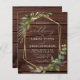 Cette élégante faire-part de mariage rustique présente un cadre géométrique en faux feuille d'or décoré d'eucalyptus et d'oliviers sur un arrière - plan en bois de grange. Le mot "mariage" apparaît dans le script calligraphique. Customisez le texte blanc avec les noms de la mariée et du marié et les détails du mariage sur le devant, et leurs initiales et l'URL du site Web au verso.