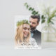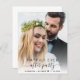 Élégant et économique, petit faire-part mariage et accueil. Le devant présente votre photo de jour de mariage superposée avec "Happily Ever After Party" dans un mélange de typographie moderne simple et un script élégant avec des swashes. Sous votre photo, ajoutez vos prénoms et votre date de mariage. Au contraire, personnalisez votre message et vos détails de réception ou de réception et ajoutez vos noms dans un script de type signature.