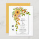 BUDGET Jaune tournesol, arc et initiales automne invitation pour un mariage budget avec code RSVP QR. Ce joli mariage présente un cadre en arc avec des tournesols jaunes, des baies et des feuilles en automne dans le coin gauche et vos initiales. Les noms sont en typographie de script. Le dos est de couleur jaune uni avec code QR pour rechercher RSVP.