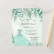 Une invitation branchée pour une Sweet 16, 16ème anniversaire fête, thème forestier enchanté. Un arrière - plan vert à l'eau avec des fougères et de la verdure d'eucalyptus, une robe verte. Le nom est écrit avec un script de style moderne écrit à la main. Personnalisez et ajoutez les détails de votre fête.