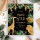 Célébrez le deuxième anniversaire de votre petite chose sauvage avec cette invitation à thème safari dans la jungle, avec des animaux en fausse feuille d'or (girafe, lion et singes), le feuillage de la jungle d'or et verte, et un arrosage de confettis d'or. Ajoutez le nom de votre enfant et les détails de votre fête dans un texte de couleur or sur un arrière - plan noir. Un motif coordonné de feuillage de jungle en vert et or sur un arrière - plan noir décore le dos de la carte.