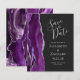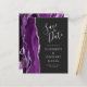 Le bord gauche de cette élégante carte de save the date de mariage moderne présente une bordure d'agate aquarelle violette agrémentée de paillettes argentées fausses. Le texte personnalisable combine des polices manuscrites gris argent et copperplate sur un fond noir cassé. Le verso présente un motif agate violet et argent assorti.