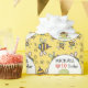 Belle tortue caricaturale tenant un ballon d'amour rose. Il a une tête et des jambes vertes, un corps jaune, une coquille brune et un visage adorable. A côté de lui se trouve une petite fleur jaune joyeuse. Le bord est jaune avec un motif d'abeilles. Modèles pour ajouter le nom et l'âge de l'anniversaire.
