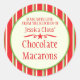 Des autocollants à pâtisserie rayée vert et rouge, parfaits pour les fêtes d'échange de biscuits de noël ou pour la vente de vos produits maison au marché de l'agriculteur et des foires artisanales à l'heure de Noël. Utilisez ces autocollants pour sceller vos cadeaux de Noël que vous donnez aux autres ou pour les faveurs des enfants à la famille et aux amis. Lit actuellement Made with love de la cuisine des Macarons au chocolat de Jessica Claus. Entièrement personnalisable pour personnaliser avec votre propre nom, et les détails du produit. Uniquement conçu par Sarah Trett.