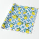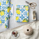This wrapping paper features a watercolor French country tile and lemon pattern in blue and yellow.