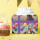 Ce papier d'emballage amusant présente une chèvre heureuse avec une pile de ballons d'anniversaire.