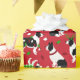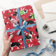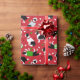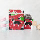 Chiens de Collie à la frontière mignonne dans des tenues de vacances festives portant chapeaux de Père Noël, bois, cordes de lumières et pois de polka et chandails de Jacquard sur un arrière - plan rouge avec des ornements épars.