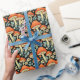 Emballage cadeau avec une illustration de champignons rétro, fleurs vintages aux couleurs vintages de bleu foncé, orange et beige.