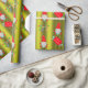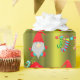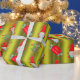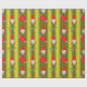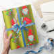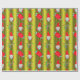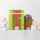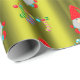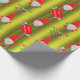 Un très joli enveloppement de Noël vert, avec un motif de petits elfes de Noël (ou gnomes) en casquette rouge sur un arrière - plan vert chartreuse. Ils sont entourés de bas de Noël rayés et colorés, de sucres de canne et de pancartes "Joyeux Noël".