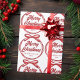 Scénario moderne et chic à travers un magnifique ruban rouge et arc lit MERRY CHRISTMAS en élégante typographie cursive. Un arc noué est super tendance pour 2025 papier d'emballage de vacances non photo. Personnalisez avec votre nom de famille ou d'entreprise au centre de cet emballage cadeau.