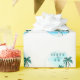 Les couleurs principales du design sont le bleu et le vert. Les éléments principaux sont la mariée, l'eau et les palmiers.