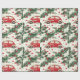 Le papier d'emballage festif présente une voiture rouge vintage entourée de branches de pin et d'ornements rouge vif, créant une atmosphère joyeuse parfaite pour les fêtes de cadeaux de vacances.