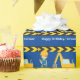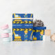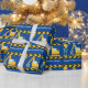 Cool sur mesure pelle de construction anniversaire de fête d'emballage papier pour un enfant qui aime les véhicules de construction jaune en noir et jaune sur papier cadeau bleu. Conception de véhicule amusant pour un petit garçon qui aime les voitures et les camions. Customisez avec le nom de votre enfant et HEUREUX ANNIVERSAIRE en blanc sous le ruban de prudence noir et jaune.
