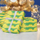 Le papier d'emballage présente une illustration originale d'un alligator vert et jaune, imprimée sur un arrière - plan jaune.