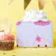 Un design sucré avec des cupcakes souriants à pois rose et une fraise sur le dessus.