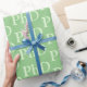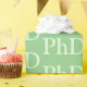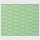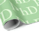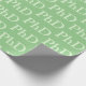 Papier d'emballage de fin de doctorat dans des tons vert clair. Le mot PhD se répète dans un motif sur toute la longueur de ce papier d'emballage.