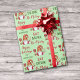 Sur ce papier d'emballage festif Holiday est un elfe de gnome mignon habillé d'un chapeau de Père Noël motif de rennes rouge et or. Il tient un verre de vin du Père Noël d'une main, et un sucre de canne rayé rouge et blanc de l'autre. Le texte rouge et vert en gras dit "MANGER BOIRE BE MERRY". Votre texte personnalisé est en vert et rouge correspondant à un côté.