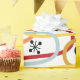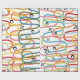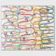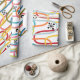 Ce papier d'emballage a un design moderne du milieu du siècle de gribouillages tournant verticalement dans des couleurs rétro avec des éclats noirs et des cercles éparpillés sur le design.
