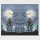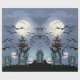 cimetière éffrayant d'halloween en bois éffrayant avec chouette halloween contre la lune folle fantômes blancs et chauves-souris volantes noires. Bleu-gris blanc et foncé.