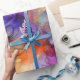 Des tourbillons vibrants de violet, d'orange et de bleu créent une composition dynamique et éthérée qui ressemble à des fleurs en fleurs