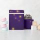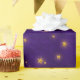 Papier d'emballage mauve et doré avec étoiles dorées lumineuses.