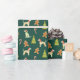 un papier d'emballage sur le thème de Noël avec un motif répétitif. Le motif est constitué de plusieurs éléments, dont des whippets portant des chapeaux de Père Noël rouges et des foulards rouges, des arbres de Noël verts décorés d'ornements rouges, des hommes en pain d'épice et des sucres de canne. La couleur arrière - plan du papier d'emballage est vert foncé, ce qui contraste agréablement avec les éléments colorés. Le design est festif et fantaisiste, ce qui le rend approprié pour envelopper les cadeaux de Noël, surtout pour les amoureux de les chiens ou ceux qui apprécient un thème de vacances ludique.