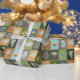 Le papier d'enveloppement Feuille d'été courbé a un motif vert, gris, jaune et bleu avec un faux look de courtepointe avec des imitations de feuilles, cônes de pin et glands. Vous pouvez rendre cette impression feuille plus petite ou plus grande sur ce papier d'emballage. Un joli emballage cadeau motif pour vos cadeaux.