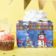 Un tableau d'aquarelle de Sandra Gale d'un neigeur traditionnel debout devant une clôture de piquetage avec des lumières de Noël brillantes reflétant la neige d'hiver. Oiseaux, maisons d'oiseaux et ornements de Noël en font une scène de Noël classique qui a l'air bien sur papier d'emballage, carte de fin de année et plus !