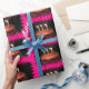 Une photo d'un papier d'enveloppement de gâteau d'anniversaire qui est lumineux et coloré. Avec un cadre rose autour d'un gâteau avec trois bougies flambantes. C'est sur le papier d'emballage.