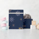 This image features a roll of elegant gift wrapping paper decorated with large, artistic gold-colored snowflake designs set against a deep navy blue background. The pattern includes various intricate snowflake shapes, some highlighted with a gold metallic effect and others in subtle contrasting tones. This luxurious and festive wrapping paper is perfect for holiday gifts, especially during winter or Christmas celebrations, adding a sophisticated and sparkling touch to any present.