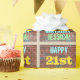 Ce design amusant sur le thème de l'anniversaire présente un message comme "HAPPY 21st BANTHDAY, JESSICA!", où le nom peut être personnalisé. L'arrière - plan est représenté par un mur en brique composé de briques de couleur rougeâtre. Le texte du message personnalisable comporte des couleurs comme le bleu, le jaune et le vert, et il a un aspect inspiré de celui des graffitis peints. Un papier comme celui-ci pourrait peut-être être utilisé pour envelopper les cadeaux d'anniversaire donnés à quelqu'un qui célèbre son vingt et unième anniversaire. [~Z0000274]