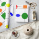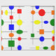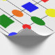 Ce papier d'emballage a une conception Bauhaus d'une grille avec des formes en rouge, jaune, orange, vert et bleu tracés dessus.