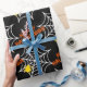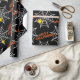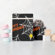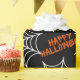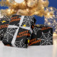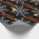 Ce papier d'emballage cool avec des toiles d'araignée et des araignées sur un arrière - plan noir est parfait pour Halloween. Orange Happy Halloween texte.