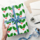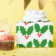 Ce papier d'emballage a un design de Noël de feuilles saints et de baies éparpillés sur un champ de blanc.