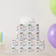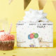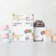 Design à thème d'anniversaire mignon avec le dessin original de Destei illustrant une jolie robe jaune couleur Labrador Retriever race dog. A côté du chien il y a des ballons colorés d'anniversaire attachés sur un os de chien et une boîte cadeau de couleur violet et jaune. L'arrière - plan a un motif ludique de confettis pastel colorés sur un arrière - plan blanc. Vous trouverez également une zone de texte personnalisable.