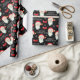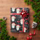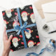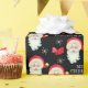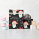 Ce papier d'emballage cadeau de Noël présente un graphique du Père Noël et est accentué avec des arcs et des flocons de neige sur l'arrière - plan noir.