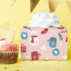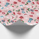Papier d'emballage de Noël pour les enfants avec un motif de bonhomme de neige, Santas, tasses à vapeur de cacao, flocons de neige, étoiles, coeurs, aiguilles de pin, brindilles de baies, cadeaux et plus dans un style mignon contre rose clair.