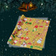 Ce papier d'emballage festif intitulé "Joyeux et Lumineux Noël" présente un design joyeux sur un fond doré. Orné d'illustrations charmantes en rouge, vert et blanc, il comprend des représentations adorables du Père Noël, de bonshommes en pain d'épice, de bonhommes de neige, de cannes de bonbon, etc., parfait pour répandre la joie des fêtes.