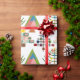 Ce papier d'emballage a un design moderne du milieu du siècle des arbres de Noël dans différents styles. L'une a une grille avec des rectangles avec des éclats à l'intérieur. Un autre comporte des rectangles arrondis avec des rectangles plus petits à l'intérieur. Un troisième a des lignes courbes avec des étoiles sur elles. L'arbre final est un triangle avec d'autres petits triangles à l'intérieur.